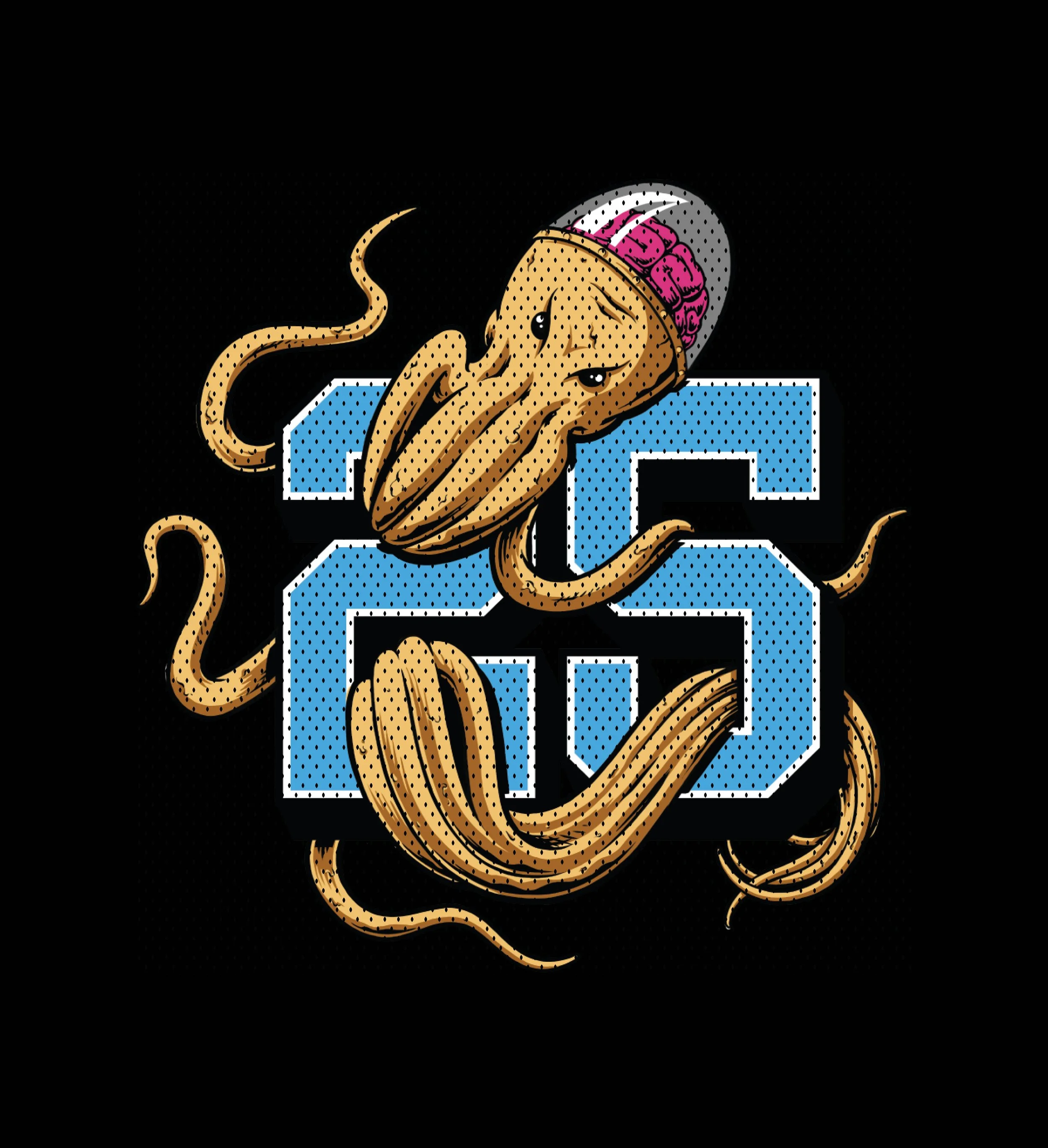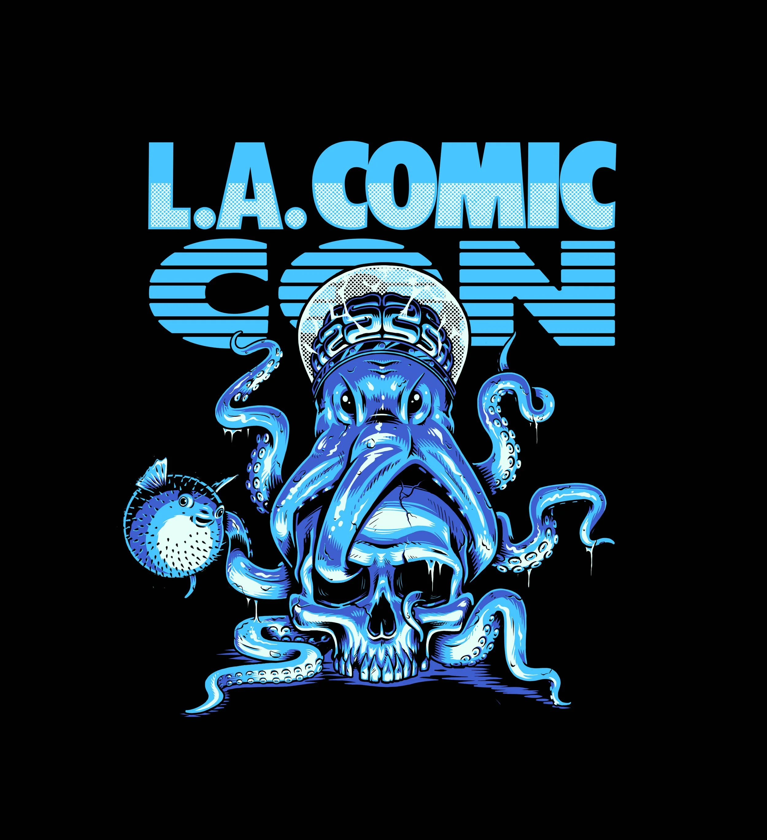 In addition to the main collection, the team wanted to build out the line by creating a few additional graphics. These were made for the 2025 Los Angeles Comic Con. The first graphic is a comic style illustration depicting Stanley, the events octopus mascot, on top of a skull w/ branding above. The second graphic is a retro sports theme featuring a cartoon Stanley entangled in large numbers that read “25". The third graphic was a homage to the events location in Los Angeles, showing two hands making the “LA” symbol, and sketched to look like the spider man hands. The fourth and last graphic was a type based graphic that was a spin on the Avengers logo. These graphics were used for exclusive event apparel and accessories.